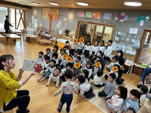 今日は、3月生まれのお友だちの誕生会でした。 名前と好きな絵本を紹介してくれました。 お父さん、お母さんからの素敵なメッセージににっこりのみんなです。 先生からのプレゼントは、「うたのえほん」から、いろいろなうたをみんなで歌って楽しみました。 他にも、かえるのうたをみんなで輪唱して遊びましたよ。 みんな大きな声で歌うことができ、にぎやかな誕生会となりました。